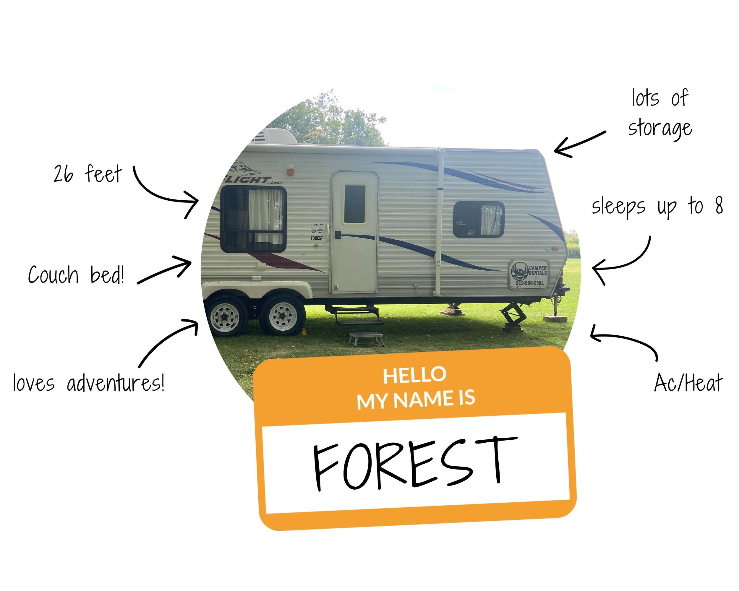 Forest is our very spacious 26 foot 2011 Jayco Jay Flight. This camper is perfect for a family or friends adventure. It’s an all good in the woods vibe with this camper! Forest weighs 7,500lbs.